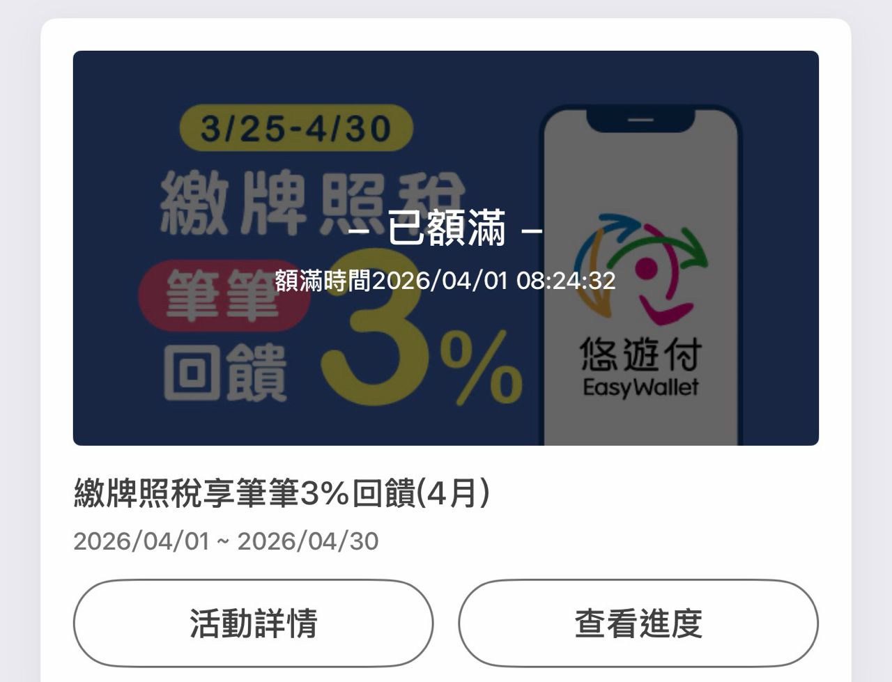 → Sheng98: 查了今年繳牌照稅的懶人包, 目前悠遊付在我的候選名單中 03/24 23:33