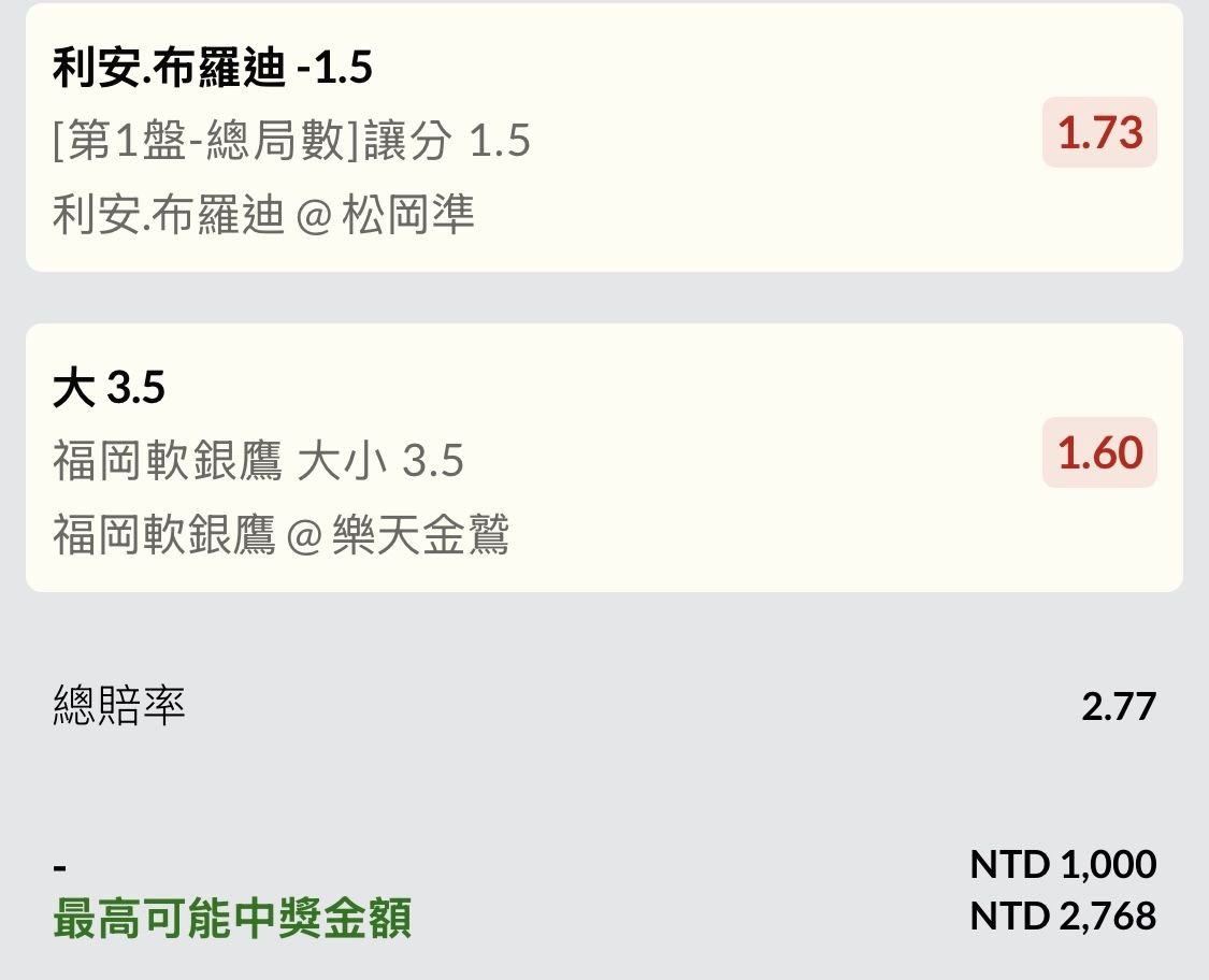 推 s94193: 撿到一張賠率2的+3.5瓊斯 衝啊啊啊 27.52.102.192 04/02 15:38
